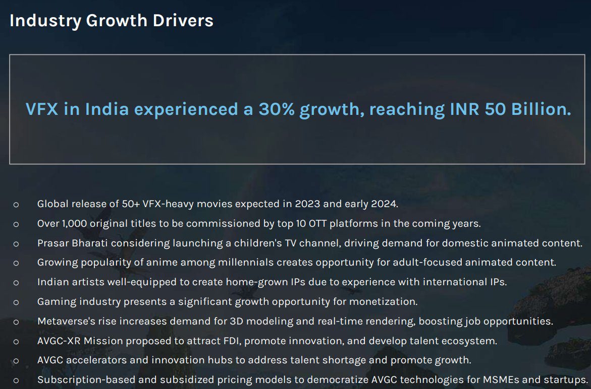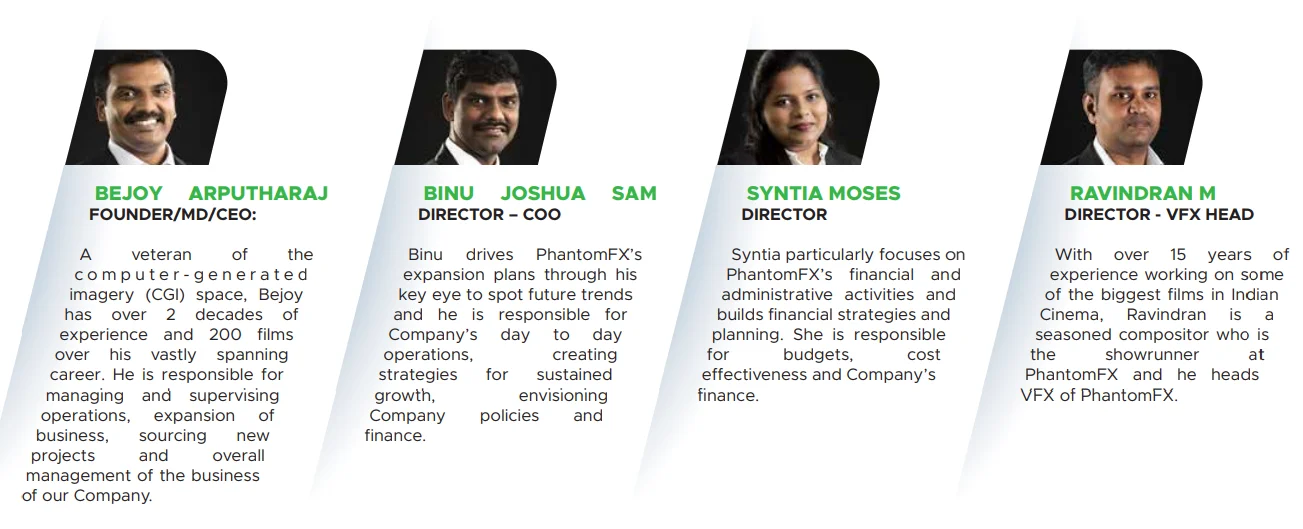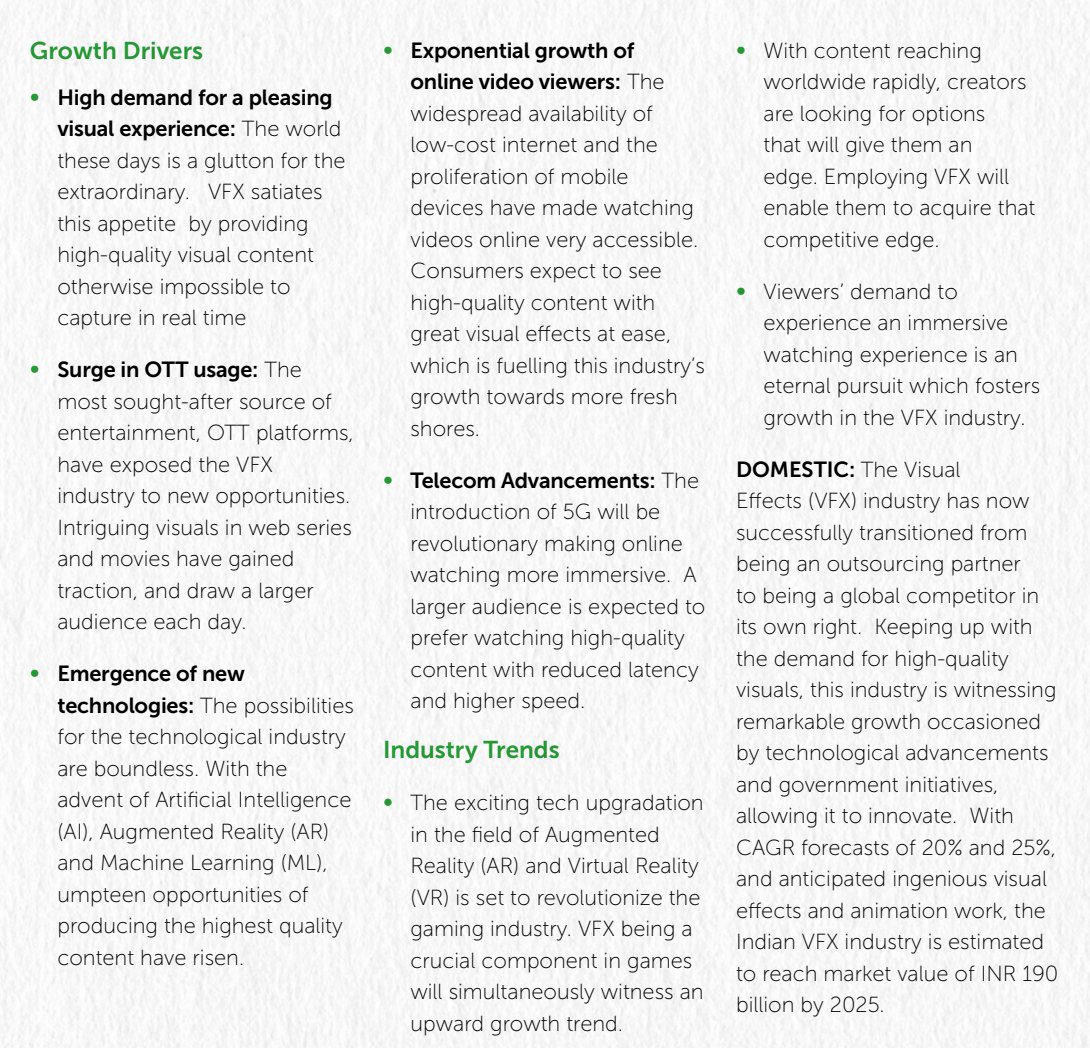 Established In 2011 with 4 people. A small studio apartment was rented, and Phantom Digital Effects (Mcap 600 Cr) was registered as a company. Its operations commenced with a few freshers who underwent on-the-job training.