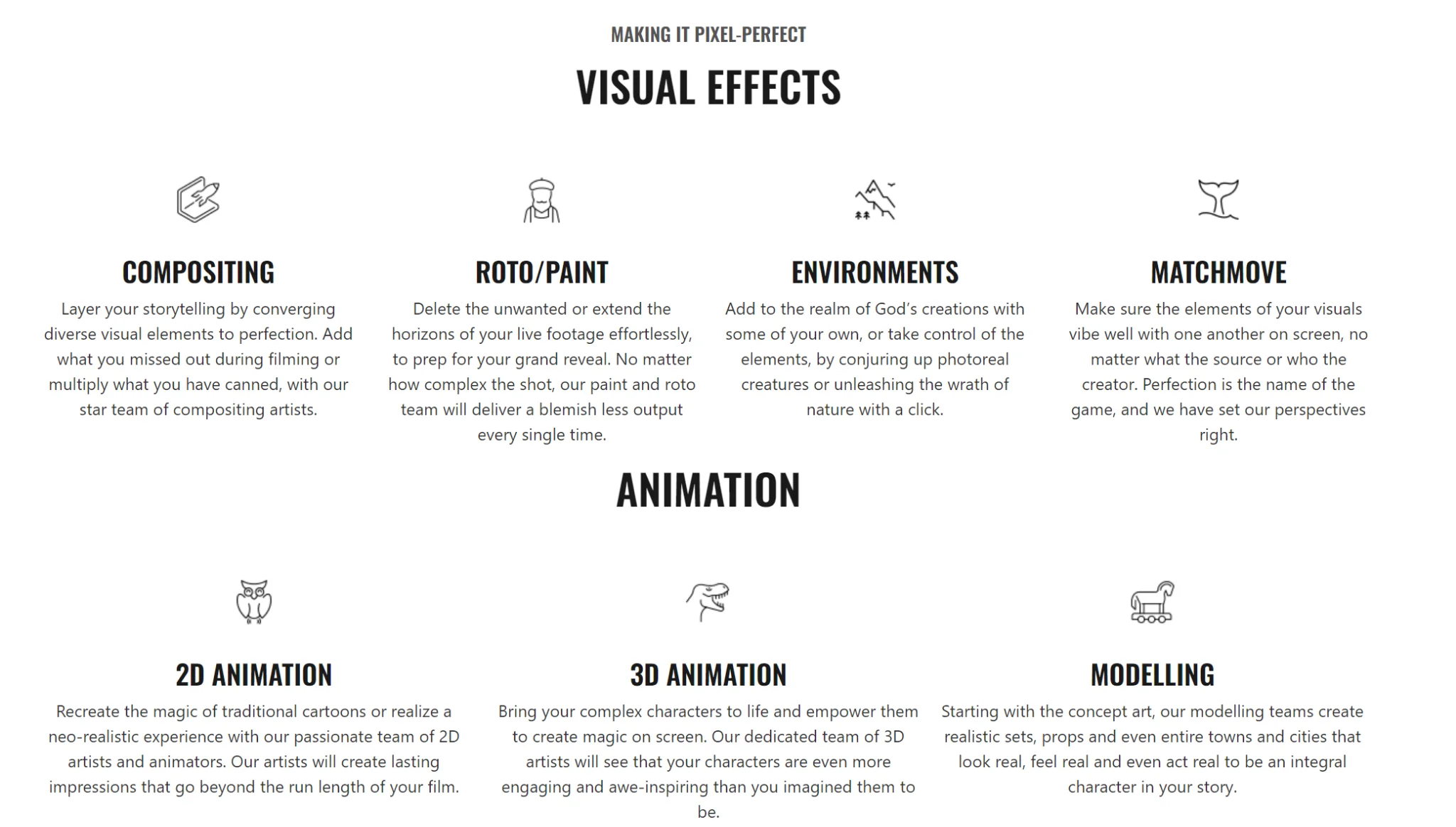 They Provide end-to-end services to production houses like completing a shot with final compositing, creating 3D elements, photo real creatures, and environments, Rig/Wire removal, paint clean-up, rotoscope, 3D match move, 3D animation (storyboard & animation), Pre-visualization Game cinematics, Fire/water Fx and other natural phenomena 3D ride animation for commercials, feature films, and web series globally.