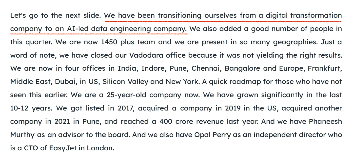 The company transitioned its focus to an “AI-led data engineering company” and sought to expand its technical offerings beyond traditional services.