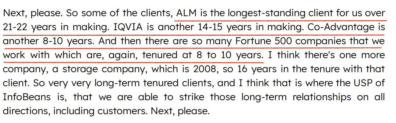 The IT services model relies heavily on long-term client retention and repeated business generation. Management highlighted the company’s USP as its ability to strike long-term relationships, with client tenures stretching 10, 15, or even 22 years.