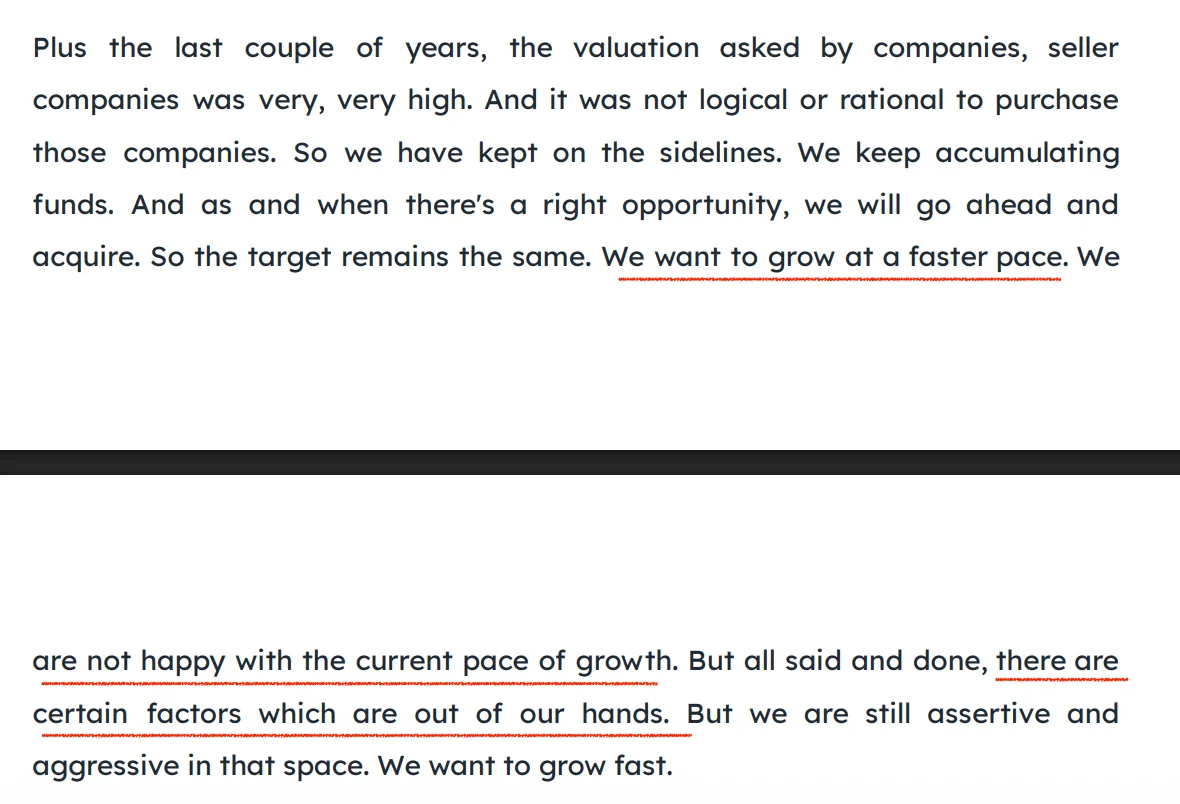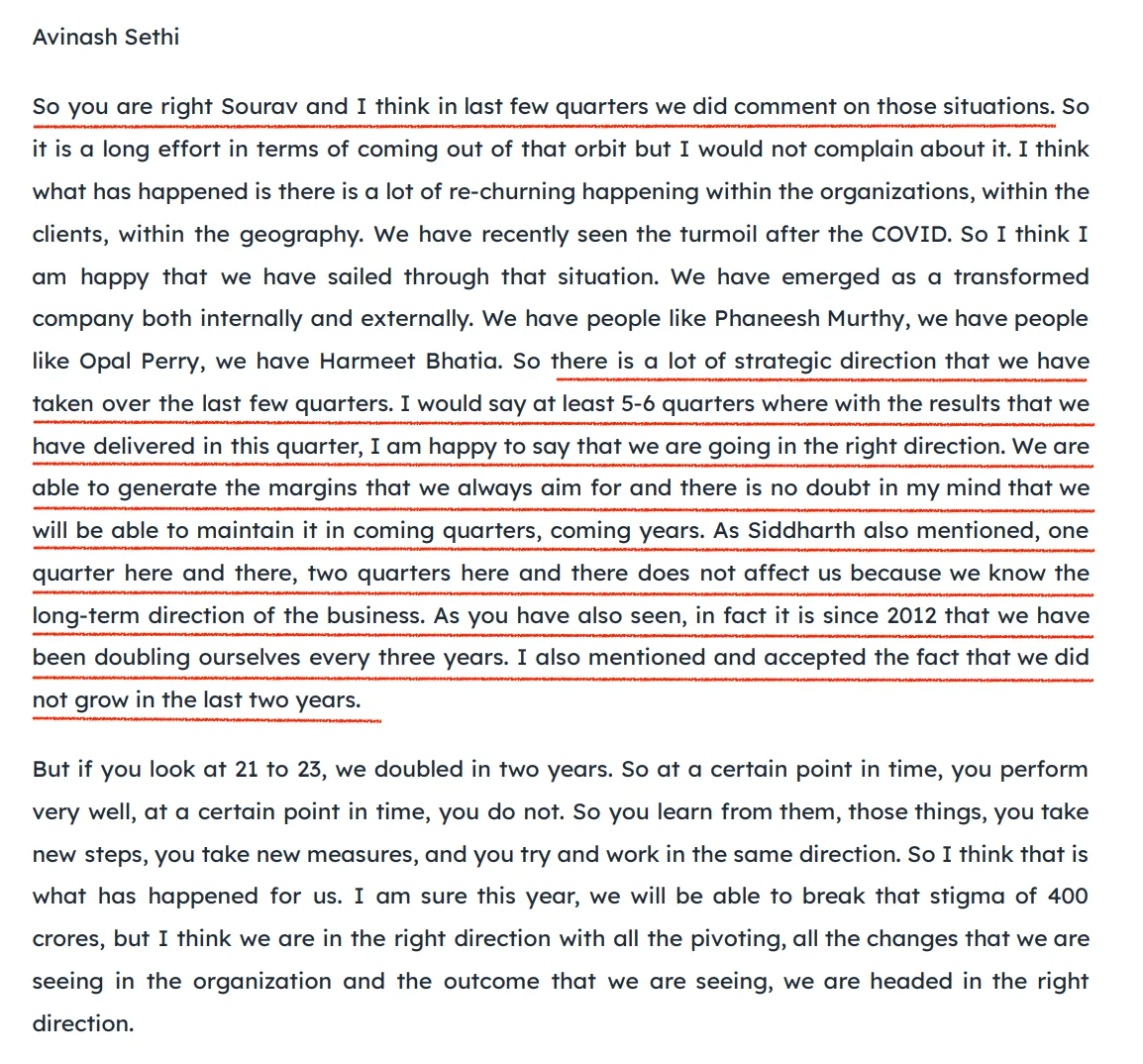 Responding to a question on stagnant revenue (~INR 400 Cr for 3 years), Avinash humbly accepts the critique, attributes it to external factors (post-COVID turmoil), and expresses gratitude for navigating challenges, without excuses or overconfidence.