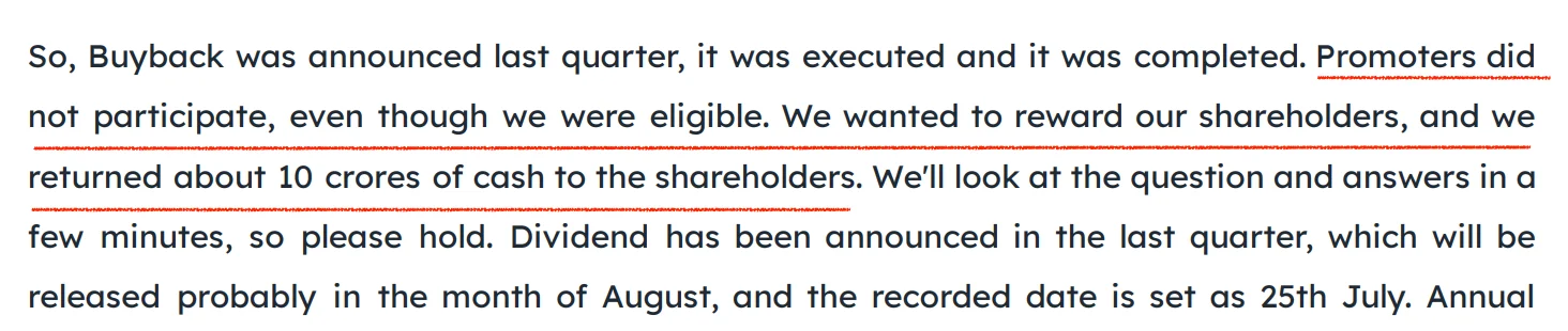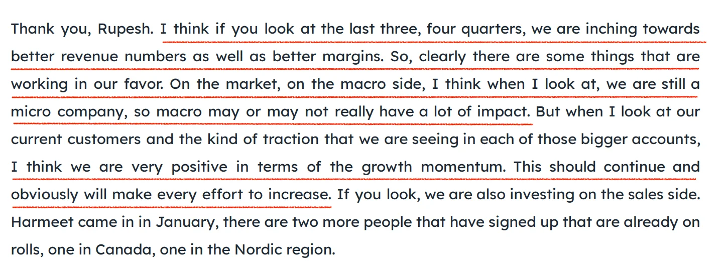 Positive mindset — expressing confidence in ongoing improvements and a proactive stance toward growth, even in a micro-company context amid US uncertainties. Note that this comment was made when the stock price crashed from 840 levels (in April 2022) to 300 levels (in May 2025).
