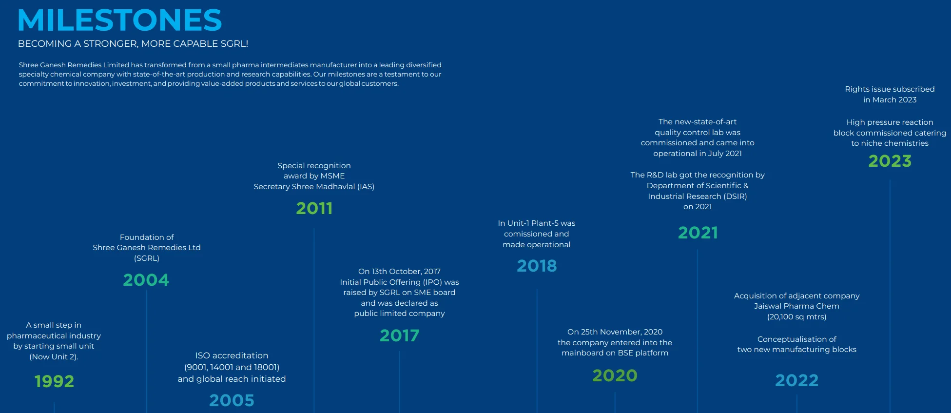 Founded in 2004, Shree Ganesh Remedies Ltd (Mcap 1080 Cr) has two decades of experience in Pharmaceutical Intermediates and Fine & Speciality Chemicals in India.